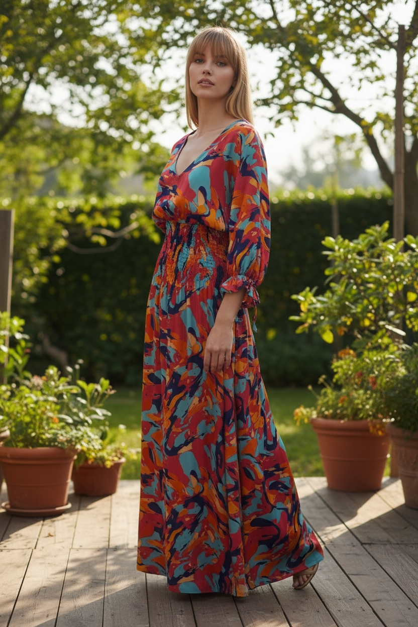 Maxi Dress with full length sleeves, under bust shirring